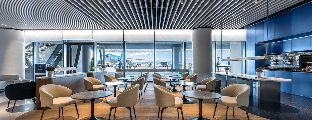 שילבנו שפע של חומרים יווניים קלאסיים כגון שיש, פסיפס, זכוכית ועץ, כדי ליצור חלל מודרני עם אסתטיקה עכשווית, אידיאלי לאווירה נינוחה שתענה על צרכיו של כל מטייל, ללא קשר לטיסה ולשעה ביום.